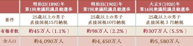 以後、選挙権の拡大を求める声の高まりにより、2回にわたり選挙法が改正され、有権者の数は次第に増えていきました。