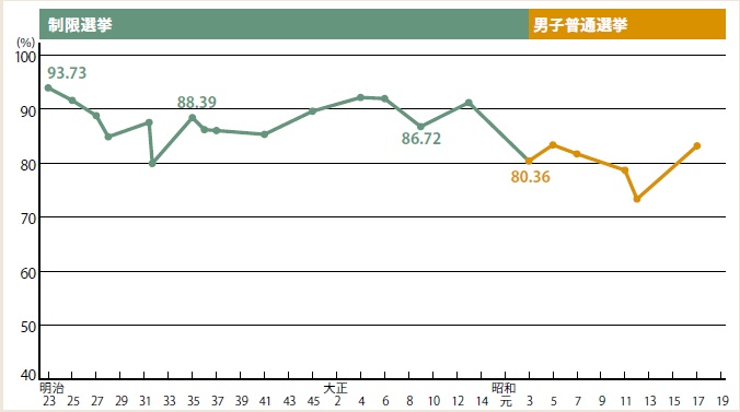 制限選挙下での投票率は概ね80~90%で推移しました。