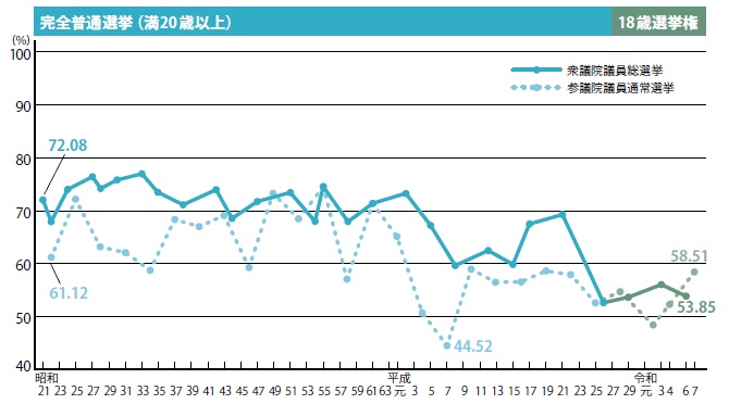 ・完全普通選挙での初めての衆議院議員総選挙(昭和21(1946)年)の投票率は72.08%、初めての参議院議員通常選挙(昭和22(1947)年)の投票率は61.12%でした。その後、昭和の時代においては、概ね60~70%で推移していましたが、平成以降、低下傾向にあります。
