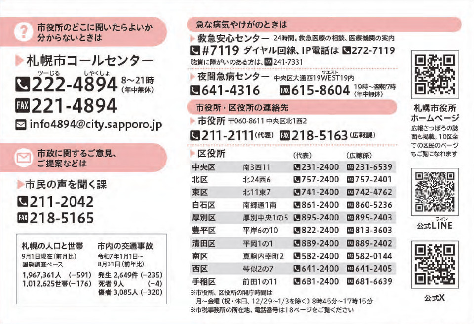 くらし 市役所・区役所などの連絡先 1/24 次の記事 発行日 : 2025年10月01日 自治体名 : 北海道札幌市 広報紙名 : 広報さっぽろ 2025年10月号 Tweet シェアする 《特集》全ての子どもが幸せに暮らすために(1)