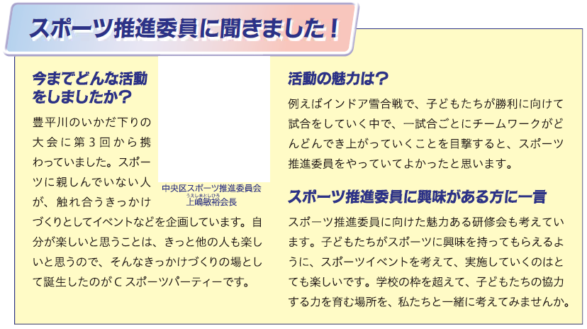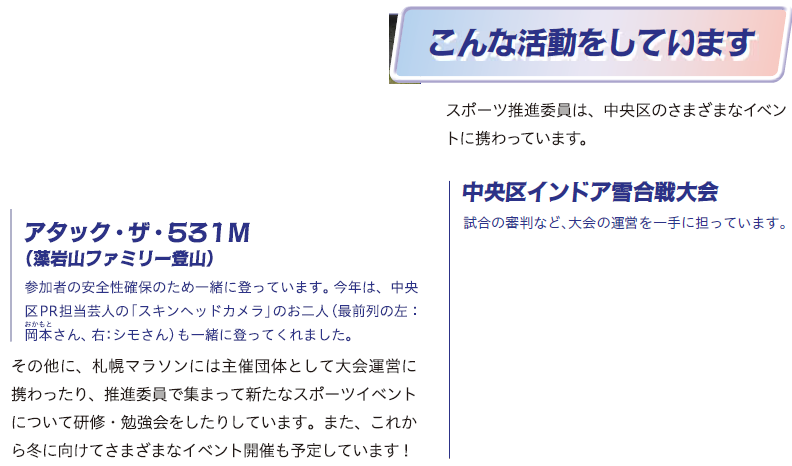 スポーツ ご存じですか?スポーツ推進委員 2/9 前の記事 次の記事 発行日 : 2025年10月01日 自治体名 : 北海道札幌市中央区 広報紙名 : 広報さっぽろ 中央区 2025年10月号 Tweet シェアする 中央区連絡先一覧 中央区からのお知らせ(10月11日からの内容です)