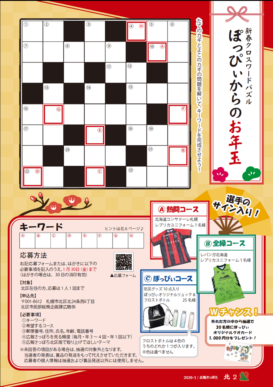 くらし 広報さっぽろ 北区 2026年1月号 P.2 2/6 前の記事 次の記事 発行日 : 2026年01月01日 自治体名 : 北海道札幌市北区 広報紙名 : 広報さっぽろ 北区 2026年1月号 Tweet シェアする 広報さっぽろ 北区 2026年1月号 表紙 広報さっぽろ 北区 2026年1月号 P.3