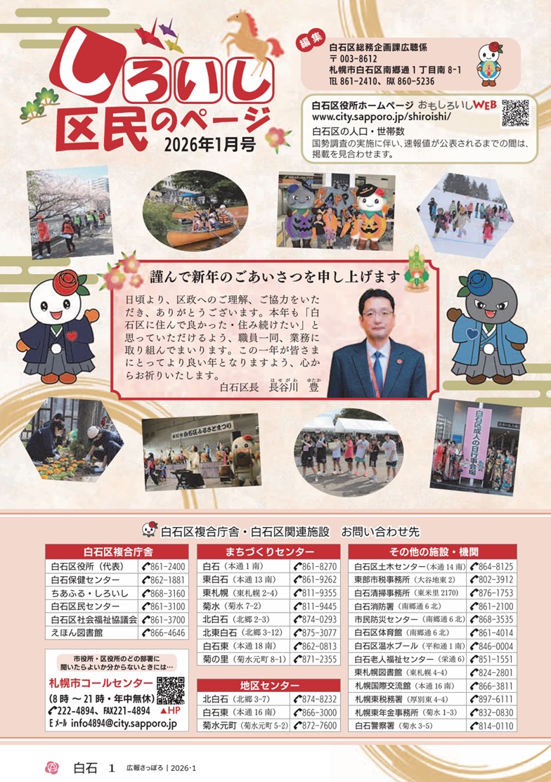 その他 広報さっぽろ 白石区 2026年1月号 表紙 1/6 次の記事 発行日 : 2026年01月01日 自治体名 : 北海道札幌市白石区 広報紙名 : 広報さっぽろ 白石区 2026年1月号 Tweet シェアする 広報さっぽろ 白石区 2026年1月号P.2