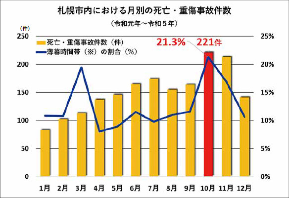 秋の夕暮れ時に「まだ明るい」と思い込んで運転をしていると、いつの間にか周囲が暗くなっていて歩行者の発見が遅れることで交通事故につながります。