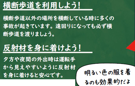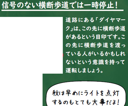 夕暮れが早まるこの季節。交通事故を防ぐために、歩行者と運転手のそれぞれの視点から危険な場面や注意すべきことをこりん・めーたんと一緒に確認しましょう。