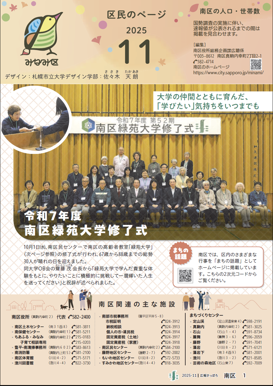 くらし 広報さっぽろ 南区 2025年11月号 表紙 1/6 次の記事 発行日 : 2025年11月01日 自治体名 : 北海道札幌市南区 広報紙名 : 広報さっぽろ 南区 2025年11月号 Tweet シェアする 広報さっぽろ 南区 2025年11月号 P.2