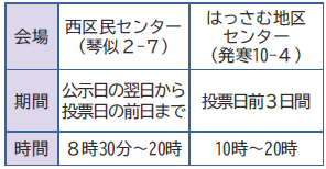 ・投票日に投票所へ行けない方は、下記の期日前投票所で事前に投票できます。日時など詳しくは投票所案内はがきをご覧ください。