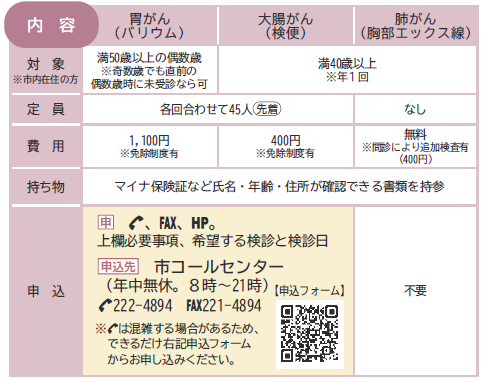 市内在住で職場などで検診を受ける機会のない方を対象に実施しています。胃がん・大腸がん検診をご希望の方は、市コールセンターへお申し込みください。