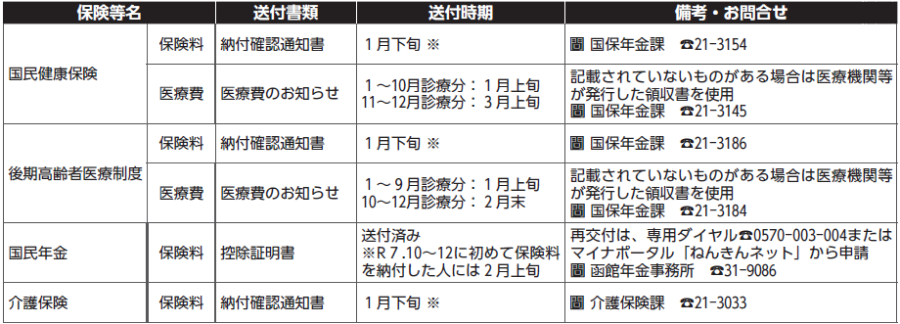 下記の保険料は社会保険料控除の、医療費は医療費控除の対象となり、所得税や住民税が減税されます。確定申告等の際に必要な各種通知書を送付します。
