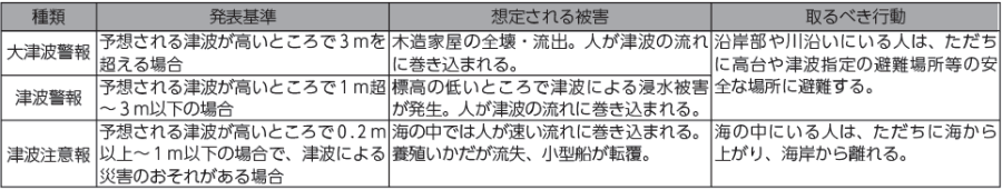 ■津波警報等の種類、想定被害と取るべき行動(避難指示は、大津波警報・津波警報が発表された場合に発令されます)