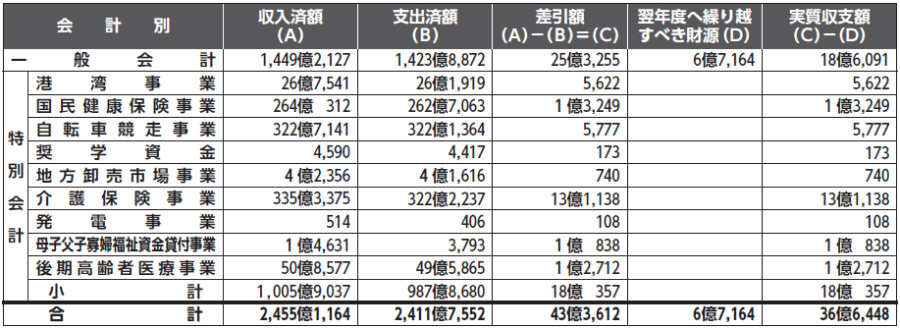 一般会計の6年度決算額は、歳入が1,449億2,127万円、歳出が1,423億8,872万円で、歳入歳出差引額は25億3,255万円となりました。これから令和7年度へ繰り越す6億7,164万円を差し引いた実質収支額は、18億6,091万円の黒字となりました。