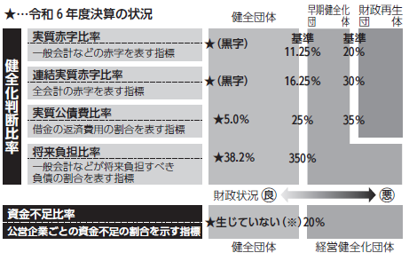 財政健全化法により、各指標が基準を超えた場合、議団体会の議決を経て財政健全化計画を策定し、改善に取り組むこととなっています。6年度決算での指標の状況は、下図のとおりです。