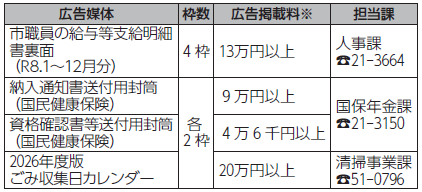 市の印刷物の広告主を募集します。広報掲載申込書・募集要綱は、担当課で配付するほか、市HPに掲載します。
