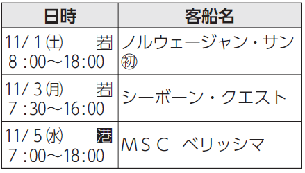 くらし (11月)クルーズ客船入港予定 15/21 前の記事 次の記事 発行日 : 2025年11月01日 自治体名 : 北海道函館市 広報紙名 : 市政はこだて 令和7年11月号 (港)港町ふ頭 (若)若松ふ頭 (初)初寄港 問合せ:港湾空港振興課 【電話】21-3493 Tweet シェアする HAKODATE Information お知らせ(5) 11月 市営函館けいりん