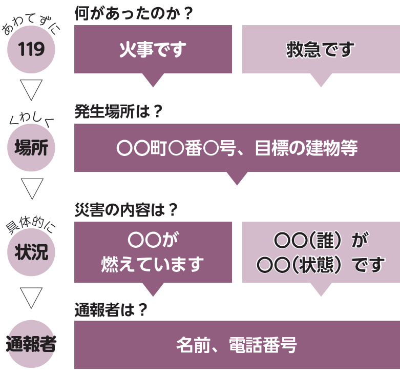 緊急通報の際は落ち着いて次の質問にはっきりと答えてください。