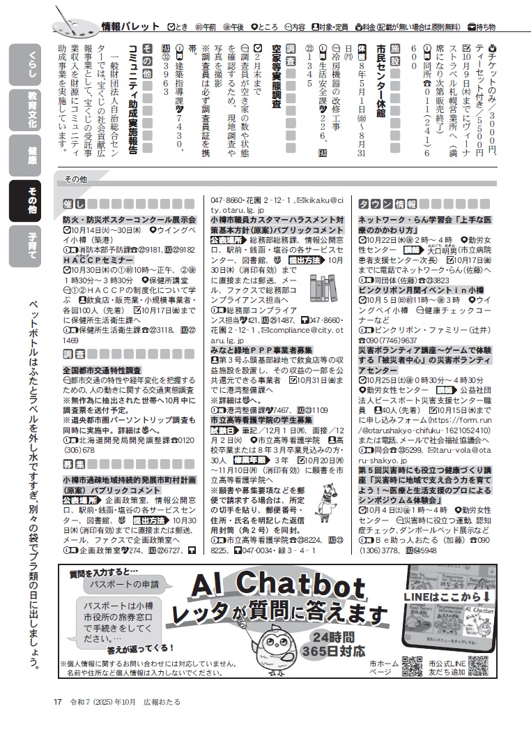 くらし 広報おたる 2025年10月号 P.17 17/20 前の記事 次の記事 発行日 : 2025年10月01日 自治体名 : 北海道小樽市 広報紙名 : 広報おたる 2025年10月号 Tweet シェアする 広報おたる 2025年10月号 P.16 広報おたる 2025年10月号 P.18