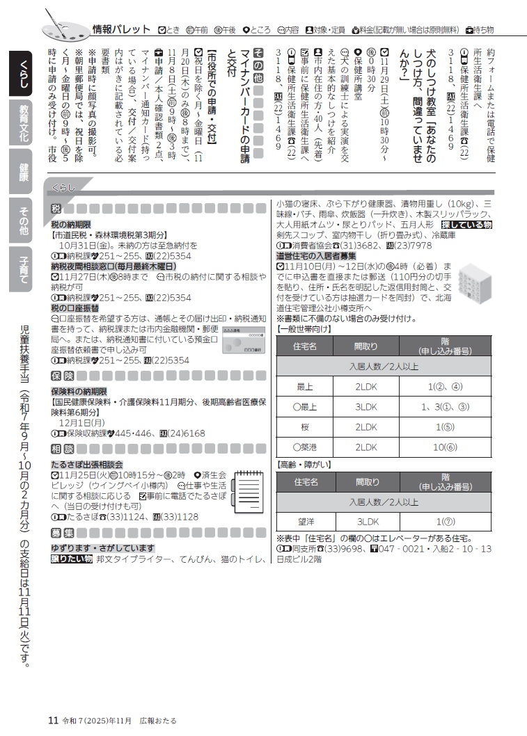 くらし 広報おたる 2025年11月号 P.11 11/20 前の記事 次の記事 発行日 : 2025年11月01日 自治体名 : 北海道小樽市 広報紙名 : 広報おたる 2025年11月号 Tweet シェアする 広報おたる 2025年11月号 P.10 広報おたる 2025年11月号 P.12