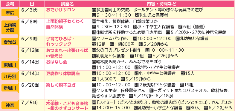 子育て 公民館 講座カレンダー 子供版 11/44 前の記事 次の記事 発行日 : 2025年05月15日 自治体名 : 北海道旭川市 広報紙名 : こうほう旭川市民「あさひばし」 令和7年5月号 ※受付開始時間や申込方法、各公民館の電話番号は17ページに掲載 Tweet シェアする 子育て・教育【催し】(2) クローズアップ Close up(1)