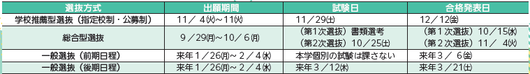 学校推薦型選抜、総合型選抜、一般選抜を、次の日程で行います。