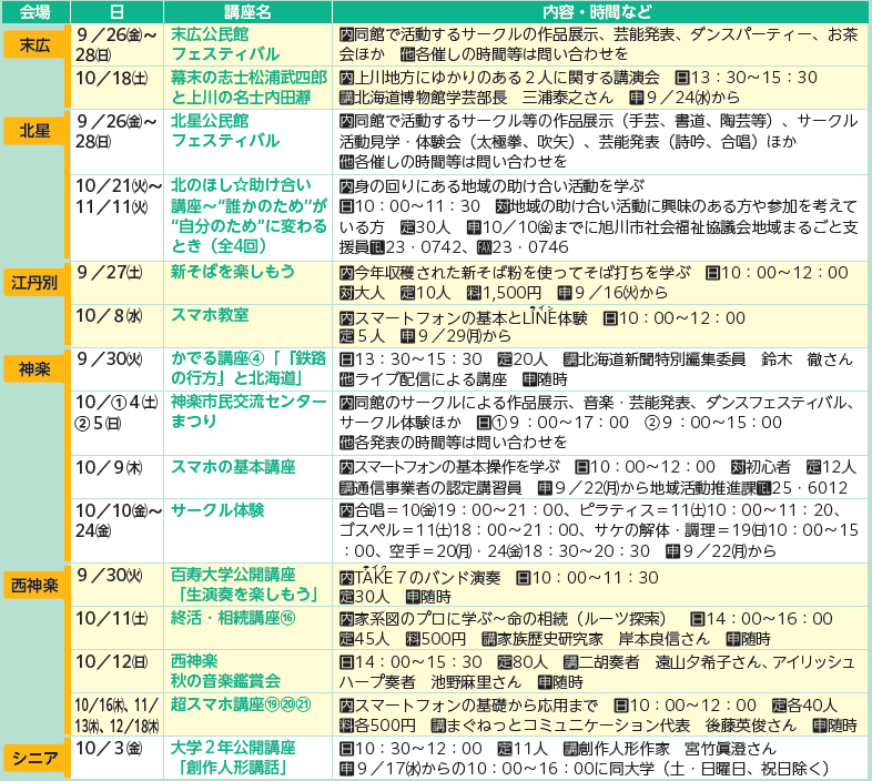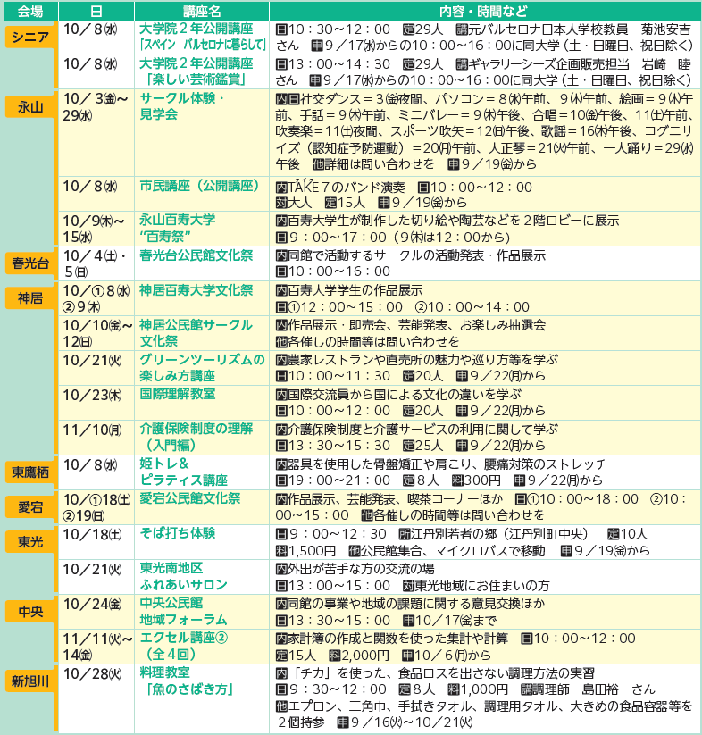 ※各公民館の電話番号は20ページに掲載。申込先・期間・方法の記載がなければ受付開始日の8:45から各公民館に電話か来館で受付け。