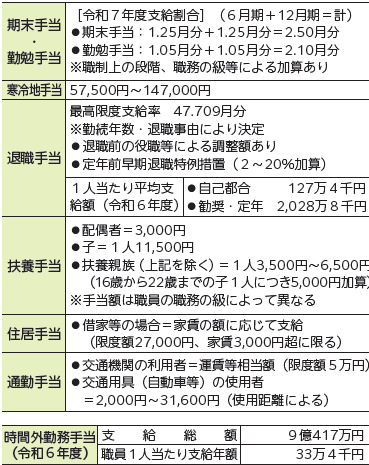 職員給与費とは、人件費のうち、職員に毎月支給される給料に各種手当(退職手当を除く)を合わせたものです。