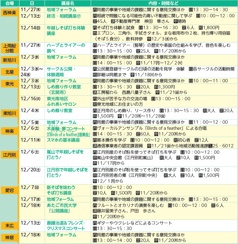 ※各公民館の電話番号は21ページに掲載。申込先・期間・方法の記載がなければ受付開始日の8:45から各公民館に電話か来館で受付け。