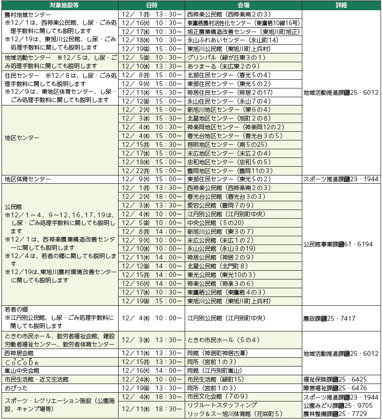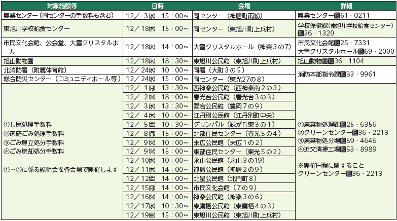12/29(月)まで、意見を募集する「使用料・手数料の見直し案」に関して、各施設の使用料およびし尿・ごみ処理手数料の個別説明会です。対象施設等以外の説明は行いませんので、ご注意ください。