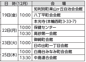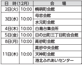 軽い運動と健康のお話を行います。飲み物と汗拭き用タオル、上靴を持参し、動きやすい服装でお越しください。いずれも1時間半程度です。悪天候の際は、中止する場合があります。