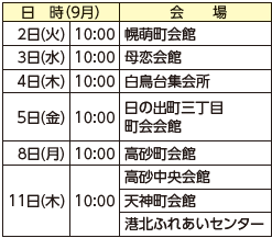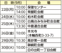 軽い運動と健康のお話を行います。飲み物と汗拭き用タオル、上靴を持参し、動きやすい服装でお越しください。いずれも1時間半程度です。悪天候の際は、中止する場合があります。