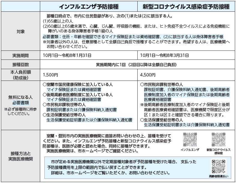 講座 【みんなの健康】高齢者の予防接種~接種料金の一部を助成します 40/62 前の記事 次の記事 発行日 : 2025年10月01日 自治体名 : 北海道室蘭市 広報紙名 : 広報むろらん 2025年(令和7年)10月号 インフルエンザの発病や新型コロナウイルス感染症に感染した場合の重症化を防ぐために、予防接種を受けましょう。 詳細:健康推進課 【電話】45-6610 Tweet シェアする 【エンジョイ!子育て】子育て応援団のお知らせ 【みんなの健康】脳卒中!?顔・腕・言葉に異常があれば、救急車を!