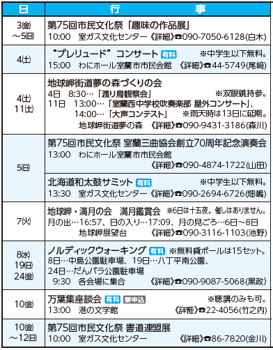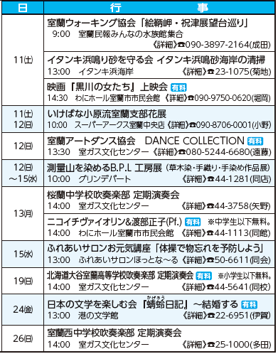 イベント 10月おでかけガイド 55/62 前の記事 次の記事 発行日 : 2025年10月01日 自治体名 : 北海道室蘭市 広報紙名 : 広報むろらん 2025年(令和7年)10月号 他のページに掲載している催しもあります。 日時・内容は、変更になる場合があります。 Tweet シェアする 伝言板(2) 困ったときのあれこれ相談