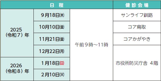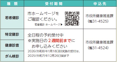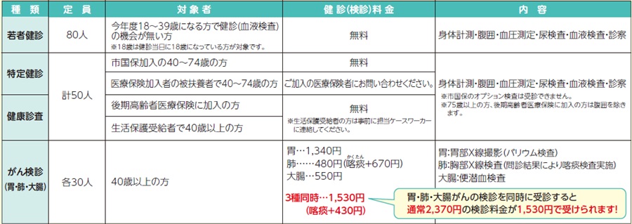■健診(検診)の種類・内容など〔各種健診は釧路市に住民票がある方が対象です〕