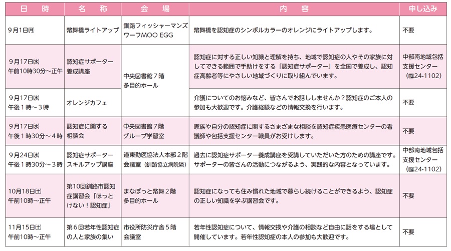 1994(平成6)年、国際アルツハイマー病協会(ADI)は、世界保健機関(WHO)と共同で毎年9月21日を世界アルツハイマーデーと制定し、この日を中心に認知症の啓発を実施しています。また、2024(令和6)年1月に施行された「共生社会の実現を推進するための認知症基本法」では、9月21日を「認知症の日」、9月を「認知症月間」と定め、さまざまな取り組みを行っています。これに併せ、市でも認知症に関するイベントを予定しています。認知症を正しく理解するきっかけとして、ぜひご参加ください。