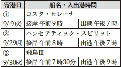 その他:今後変更・中止となる可能性あり。入出港は天候等の理由により前後する場合あり