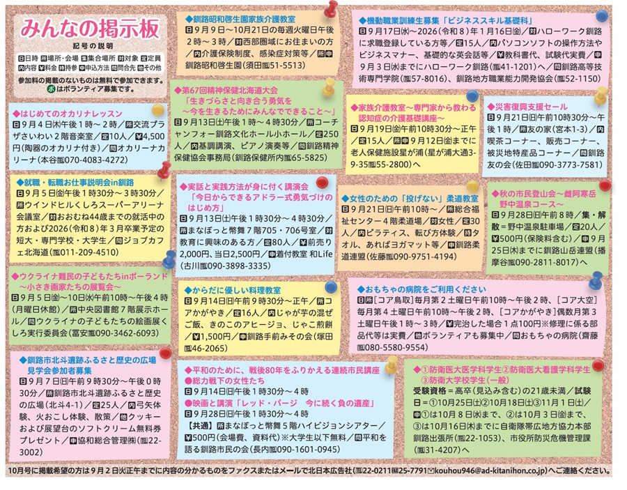 くらし みんなの掲示板 37/43 前の記事 次の記事 発行日 : 2025年09月01日 自治体名 : 北海道釧路市 広報紙名 : 広報くしろ 2025年(令和7年)9月号 Tweet シェアする 生涯学習ガイド 9月(3) ようこそ!子どもの本の森へ!