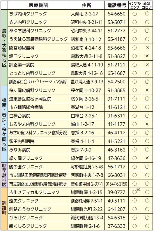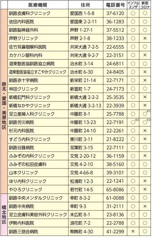◆釧路市高齢者の季節性インフルエンザおよび新型コロナ定期接種実施医療機関一覧