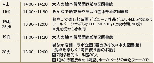内容:11/1(土)9:30~13:00にぬいぐるみを預かり、11/3(月)13:30「ミニおはなし会、ワークショップ」に参加後、ぬいぐるみを返却