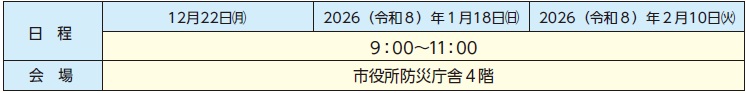 日程・会場:日程が変更となる場合は市ホームページ等でお知らせします。