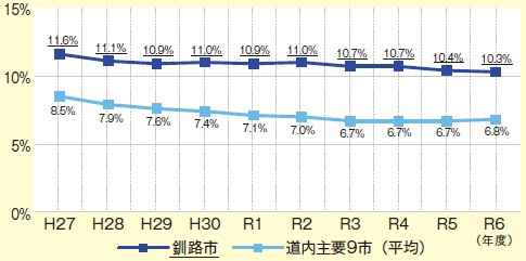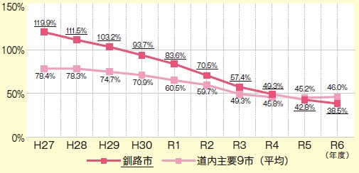実質公債費比率とは、釧路市に入ってくる市税や交付税等のうち、何%が借金の返済等に使われているかを示す値です。