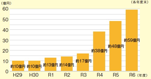 2024(令和6)年度決算余剰金のうち、9,000万円を財政調整基金へ積み立てたため、2025(令和7)年6月末時点の残高は約60億円となっています。