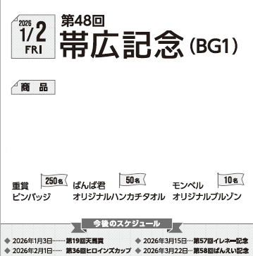 2日(金)は、第48回帯広記念、3日(土)は第19回天馬賞を開催します。今年度のBG1競走開催日には場内に設置している二次元コードからスマホくじに参加できます。