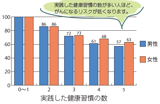 5つの健康習慣のうち、0または1つのみ実践した場合のリスクを100とした場合