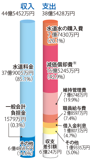 収入は44億5452万円(前年度比0.7%増)、支出は38億5428万円(同2.6%増)で、6億24万円の黒字となりました。人件費や物価の上昇に伴う浄水場の設備点検委託料の増加などにより、黒字額は前年度と比較して減少しました(同10.4%減)。なお、黒字分は借入金の返済や施設の更新などに使用する予定です。