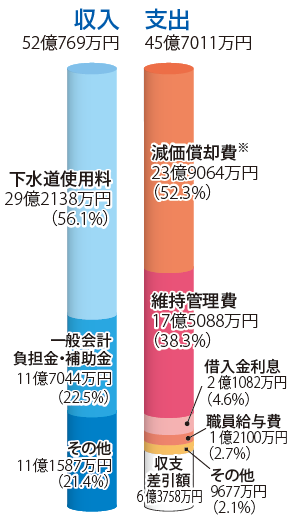 収入は52億769万円(前年度比0.2%減)、支出は45億7011万円(同0.4%減)で、6億3758万円の黒字となりました。十勝川浄化センターの維持管理負担金の減少などにより、黒字額は前年度と比較して増加しました(同1.9%増)。なお、黒字分は借入金の返済や施設の更新などに使用する予定です。