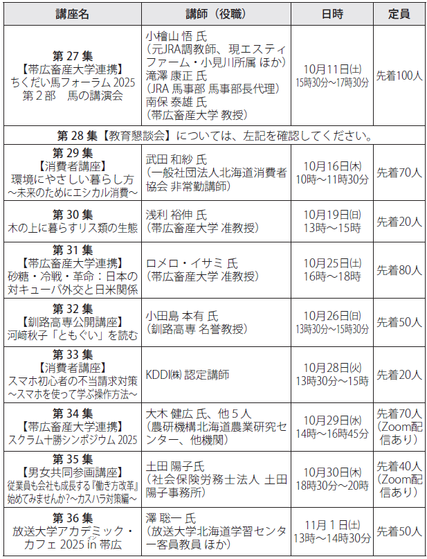 未就学児(2歳以上)の託児希望は、とかちプラザが会場の講座は各開催日の一週間前まで、第35集は10月16日(木)までに申し込み。