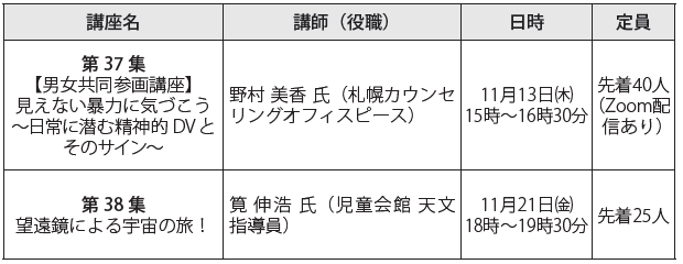 Zoom(ズーム)受講の場合は、講座の2日前まで(土・日曜日、祝日を除く)に市ホームページから申し込み。第37集の未就学児(2歳以上)の託児希望は、10月30日(木)までに申し込み。