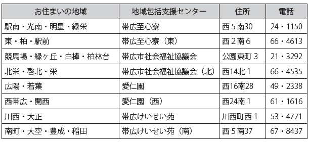 地域包括支援センターは市内に8カ所あり、お住まいの地域によって担当が異なります(下表)。