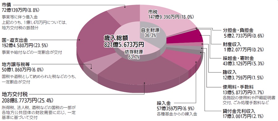 歳入の内訳を見ると、市民税などの市税収入が147億9,390万円(前年度比2.5%減)、地方交付税が208億8,773万円(前年度比2.3%増)となりました。