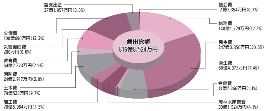 一般会計の歳出総額は816億8,524万円(前年度比6.3%増)となりました。