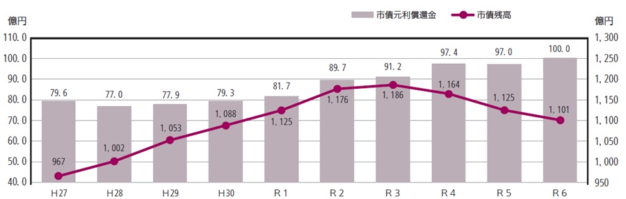 市債残高については令和3年度にピークを迎え、以降は減少していく見通しとなっています。
